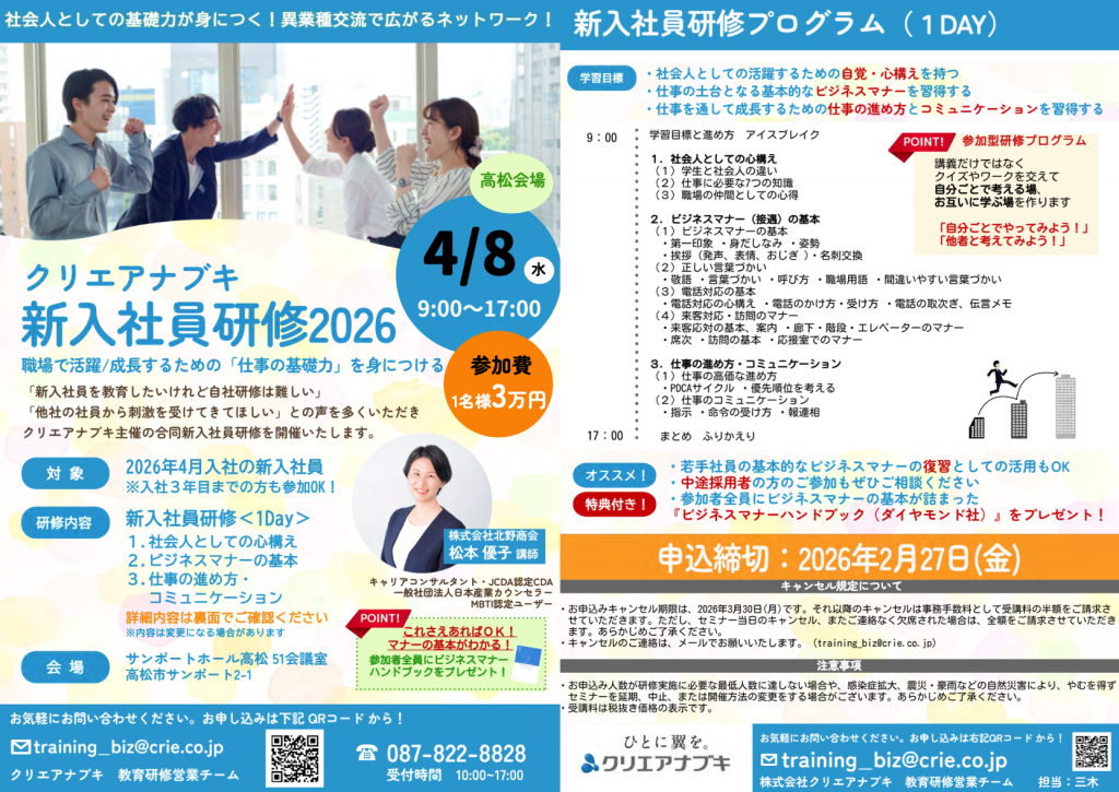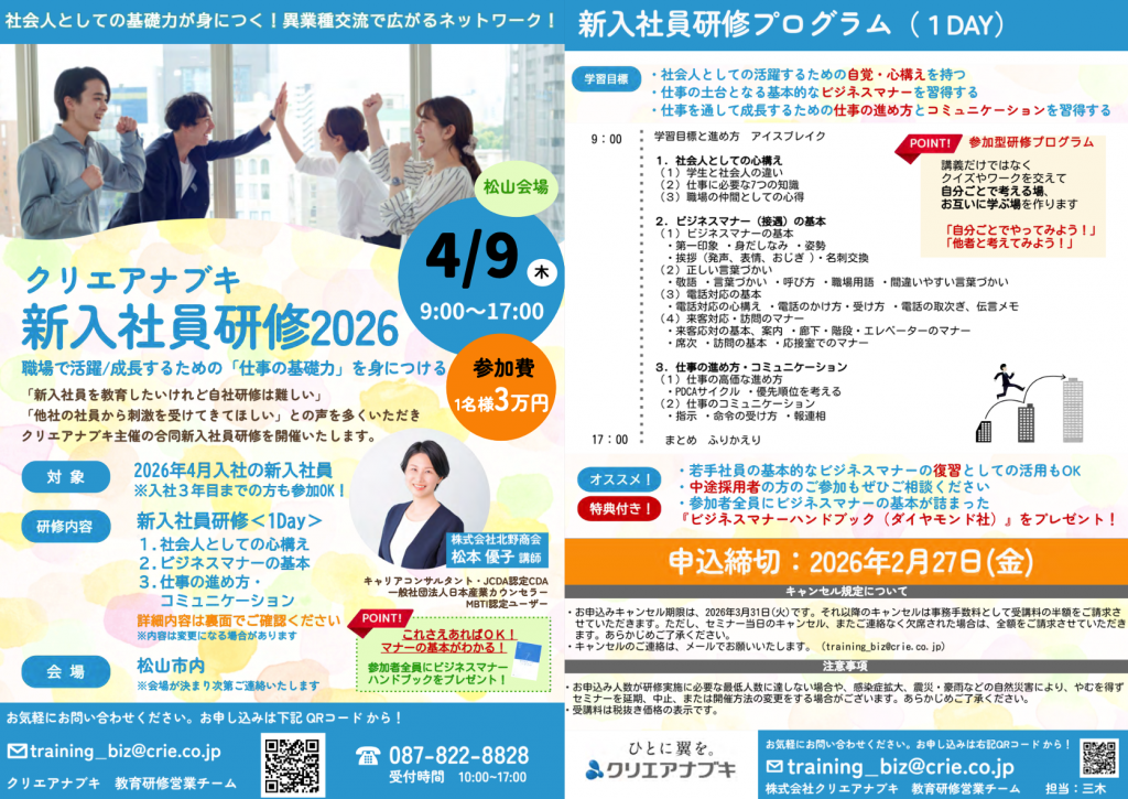 クリエアナブキさん主催で「新入社員研修(公開セミナー)」を高松・松山で開催します。